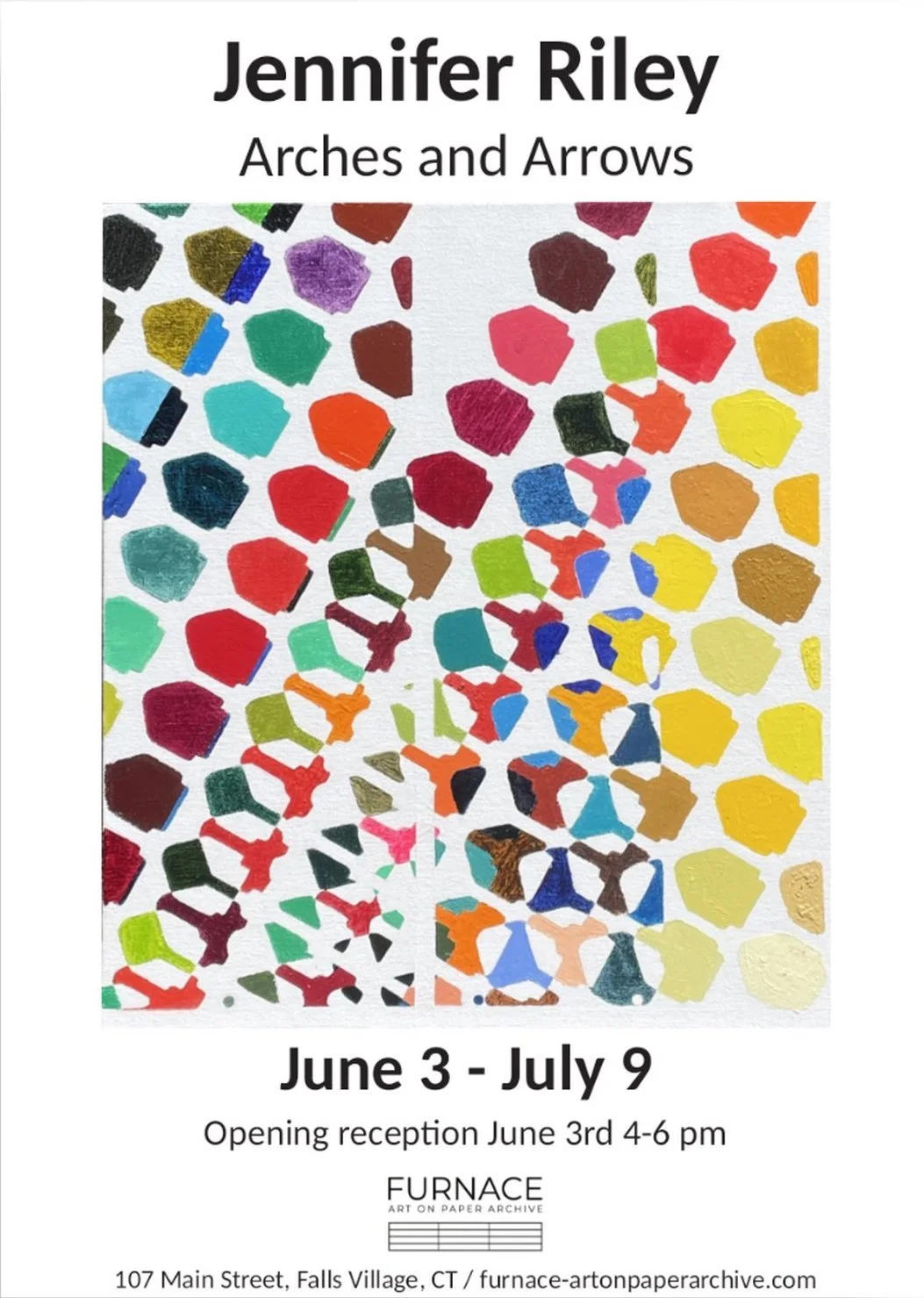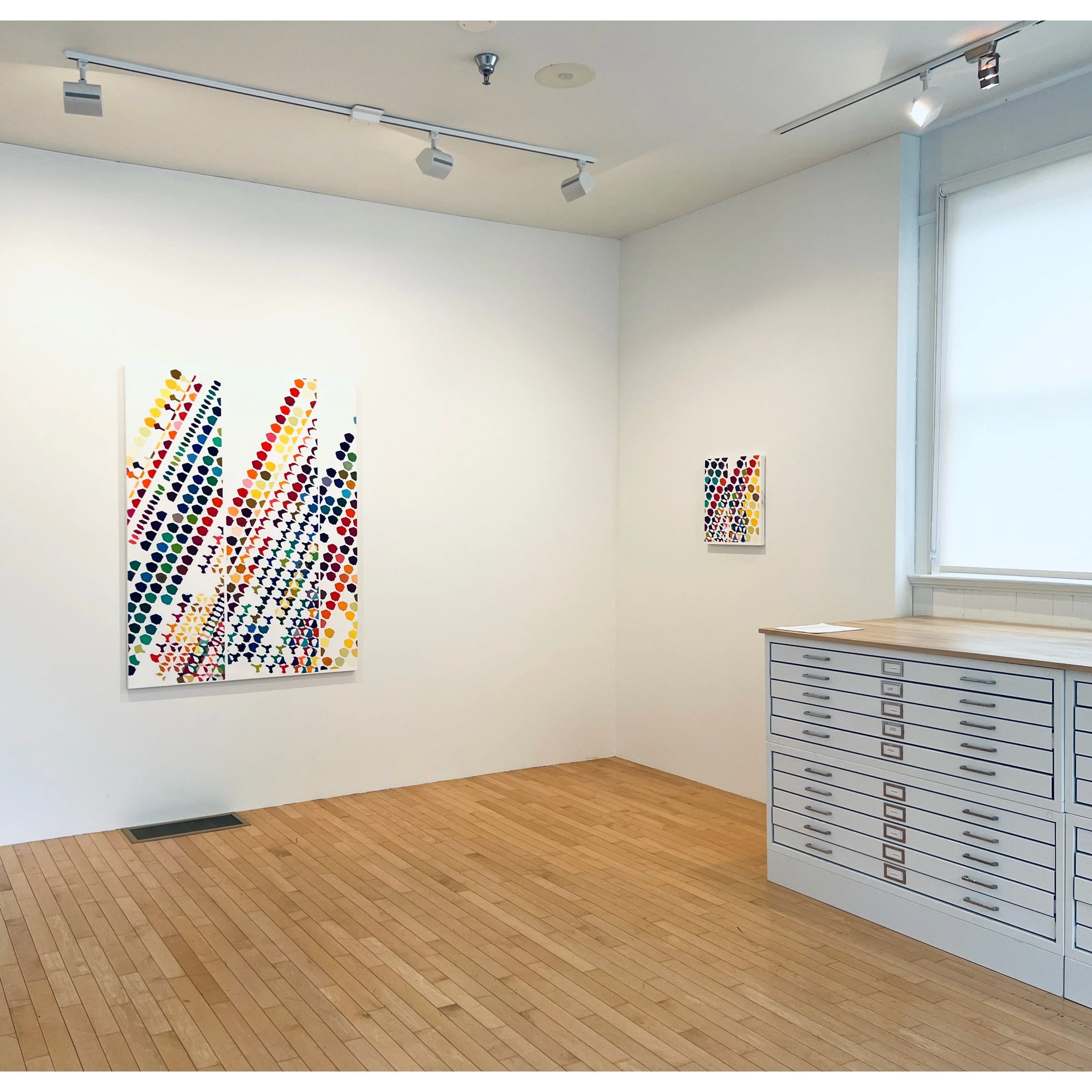 Inspired by found patterns of steel remainders from the auto-engine industry, Jennifer Riley takes these shapes and uses them to define and delineate areas for color to express notions of transition from whole to part through subtraction and change.